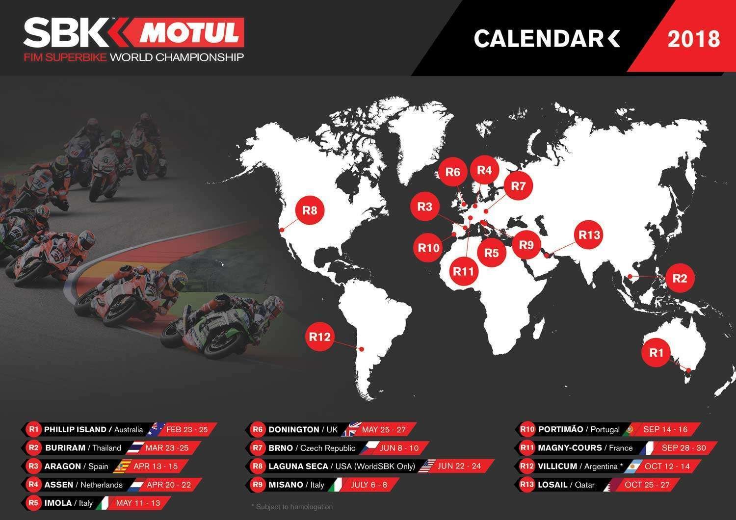 Hoy ha sido anunciado por la FIM y la organización del World Superbike el calendario provisional para la temporada del 2018 y allí está presente el sur de América con una de las 13 válidas.